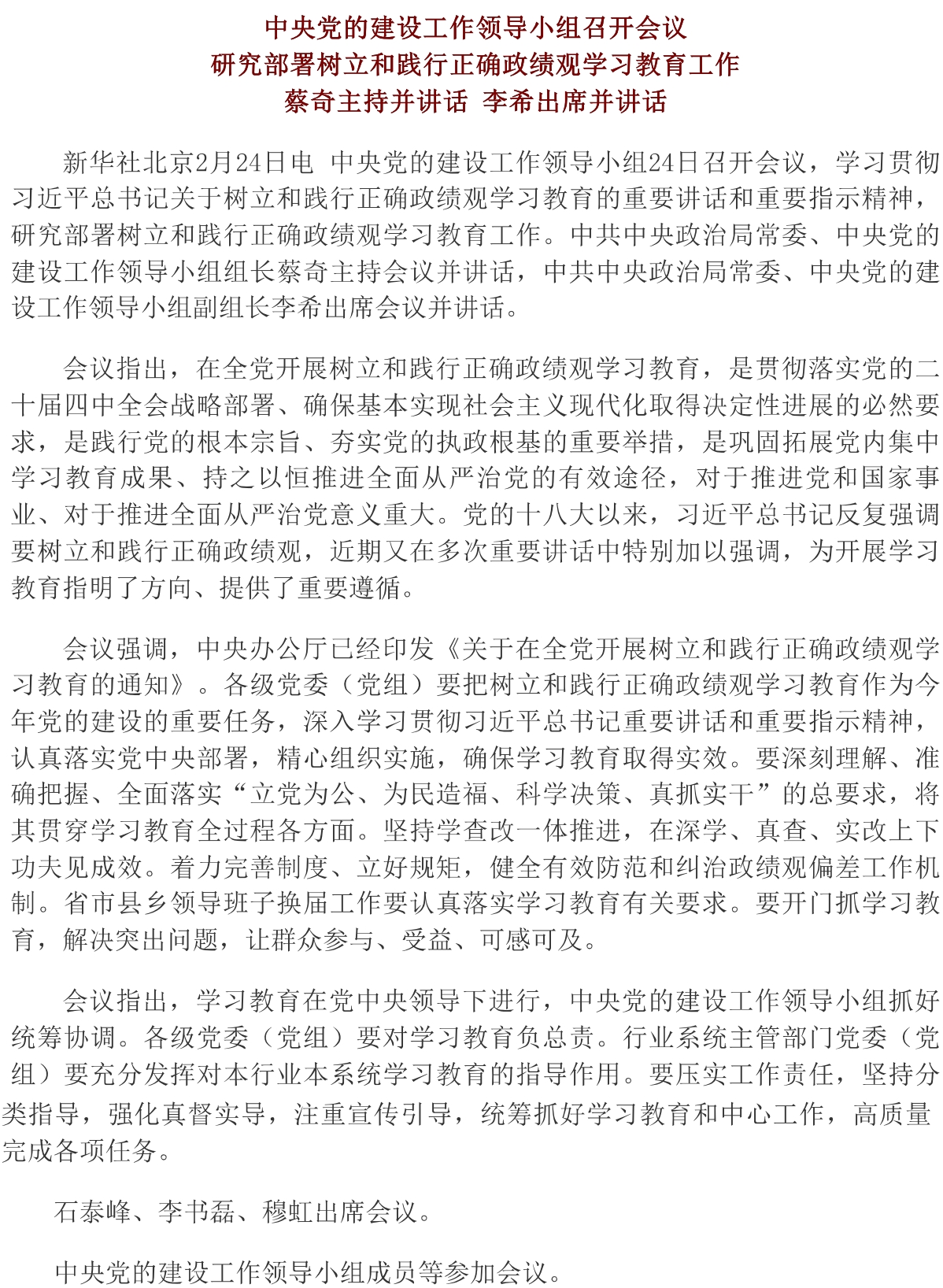 中央黨的建設(shè)工作領(lǐng)導(dǎo)小組召開(kāi)會(huì)議研究部署樹(shù)立和踐行正確政績(jī)觀學(xué)習(xí)教育工作