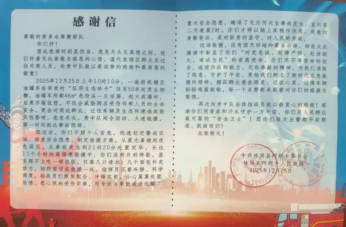 2025年12月25日上午,一輛載有46立方米危化品的油罐車(chē)在阿朗鄉(xiāng)布崗村發(fā)生側(cè)翻,司乘人員受傷,?;反嬖谛孤?、燃爆重大風(fēng)險(xiǎn),嚴(yán)重威脅人民群眾生命財(cái)產(chǎn)及周邊生態(tài)環(huán)境安全。接報(bào)后,公司兼職消防隊(duì)聞令而動(dòng)、火速馳援,第一時(shí)間抵達(dá)現(xiàn)場(chǎng)開(kāi)展處置。