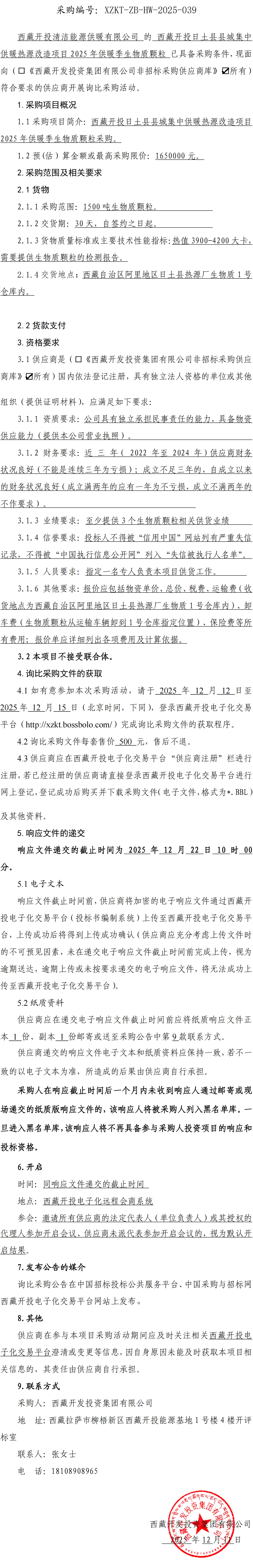西藏開(kāi)投日土縣縣城集中供暖熱源改造項(xiàng)目2025年供暖季生物質(zhì)顆粒詢比采購(gòu)公告